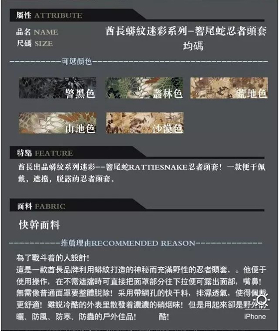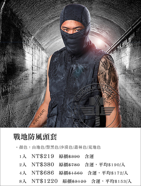 | 戰地防風頭套-十種以上的不同戴法,變換出不同的效果!獨特的無縫設計,採用特殊的高性能布料,透氣、吸汗、速乾、柔軟平均每入最低只要153元起(含運)即可購得戰地防風頭套1入/2入/4入/8入,顏色:山地 售價:153 我要購買 |
